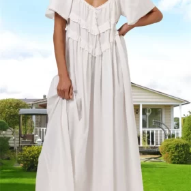 Women White Long Dress Elegant Short Sleeve Low-cut Backless Solid Loose Swing Dress Summer Bohemian Streetwear