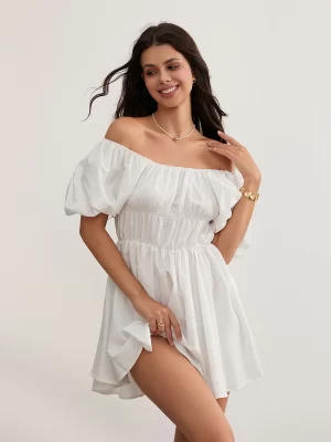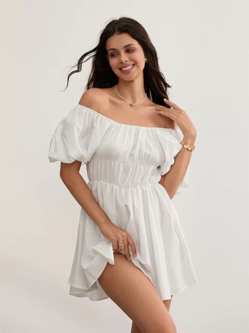 Women Summer White Mini Dress Short Puff Sleeve Off Shoulder Pleated Dress 2024 Casual Bohemian Holiday Casual Dresses