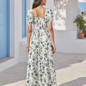 Women Print Long Dress Smocked Waist Button V Neck Short Sleeve Ruffle Hem Flowy Dresses Summer Holiday Casual Loose Dresses
