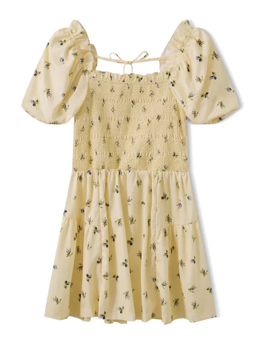Women Puff Sleeve Mini Dress Summer Retro Floral Print Square Neck A-Line Dress for Party Casual Bohemian Streetwear