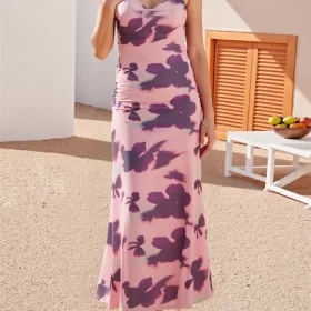 Women’s Summer Floral Print Cami Dress Sleeveless Spaghetti Strap Cowl Neck Back Cross Slim Fit Long Dress