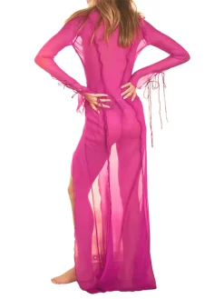 Women Mesh Sheer Long Dress, Long Sleeve V Neck See-through Slit Dress for Party Beach Cover-ups Dresses