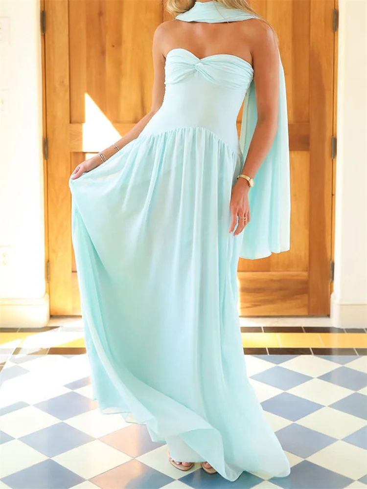Women Long Dress Solid Color Tube Dress Summer Fashion Backless Casual Strapless Dress with Choker Scarf