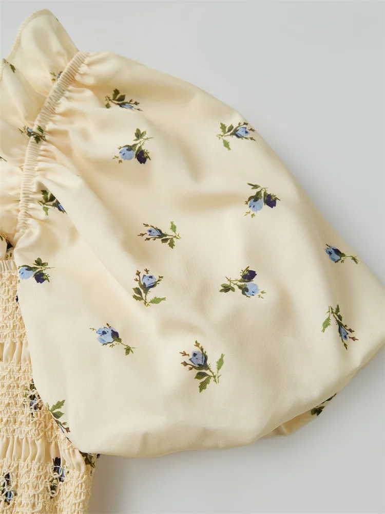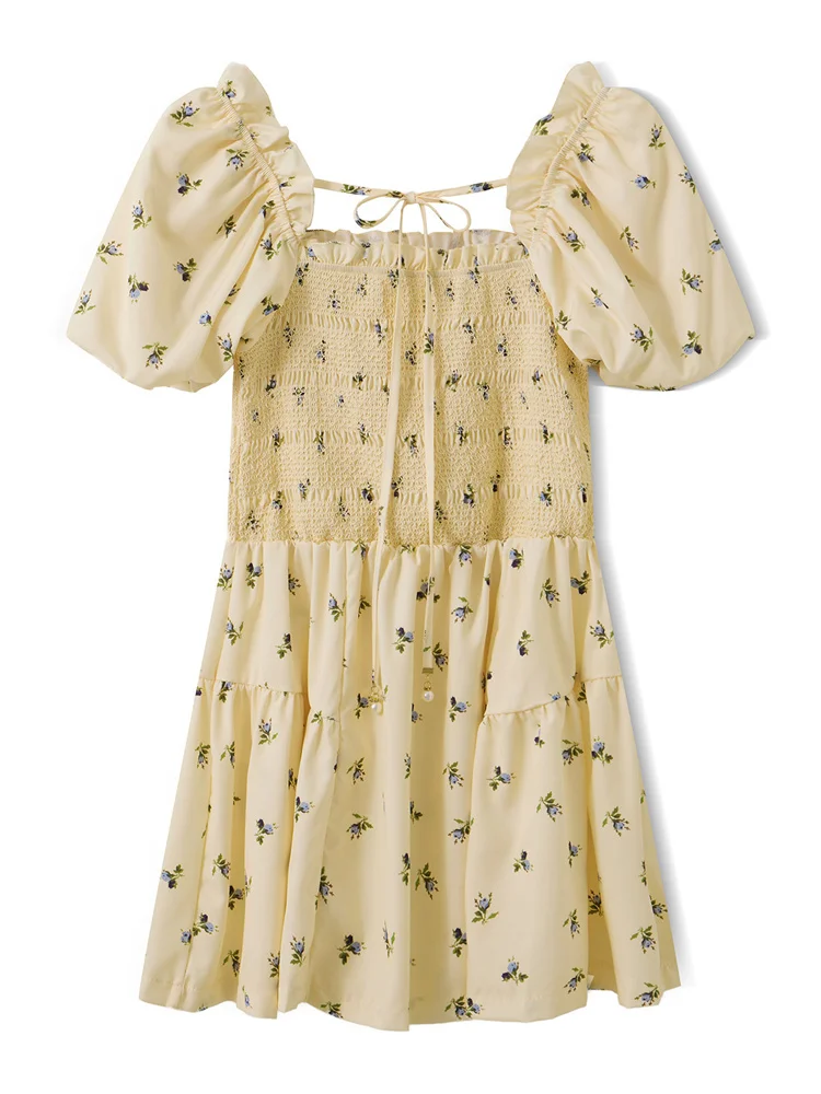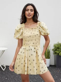 Floral print/contrasting color, square neckline, bubble short sleeves, A-line and mini length; Casual dress with sleeves; Elegant dress for women, highlighting feminine charm