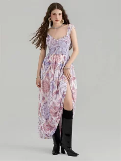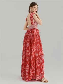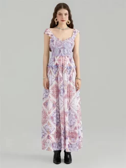Women’s Long Dress Vintage Fashion Print Sweetheart Neck Cap Sleeve Smocked Waist A-Line Layered Dress for Party Club